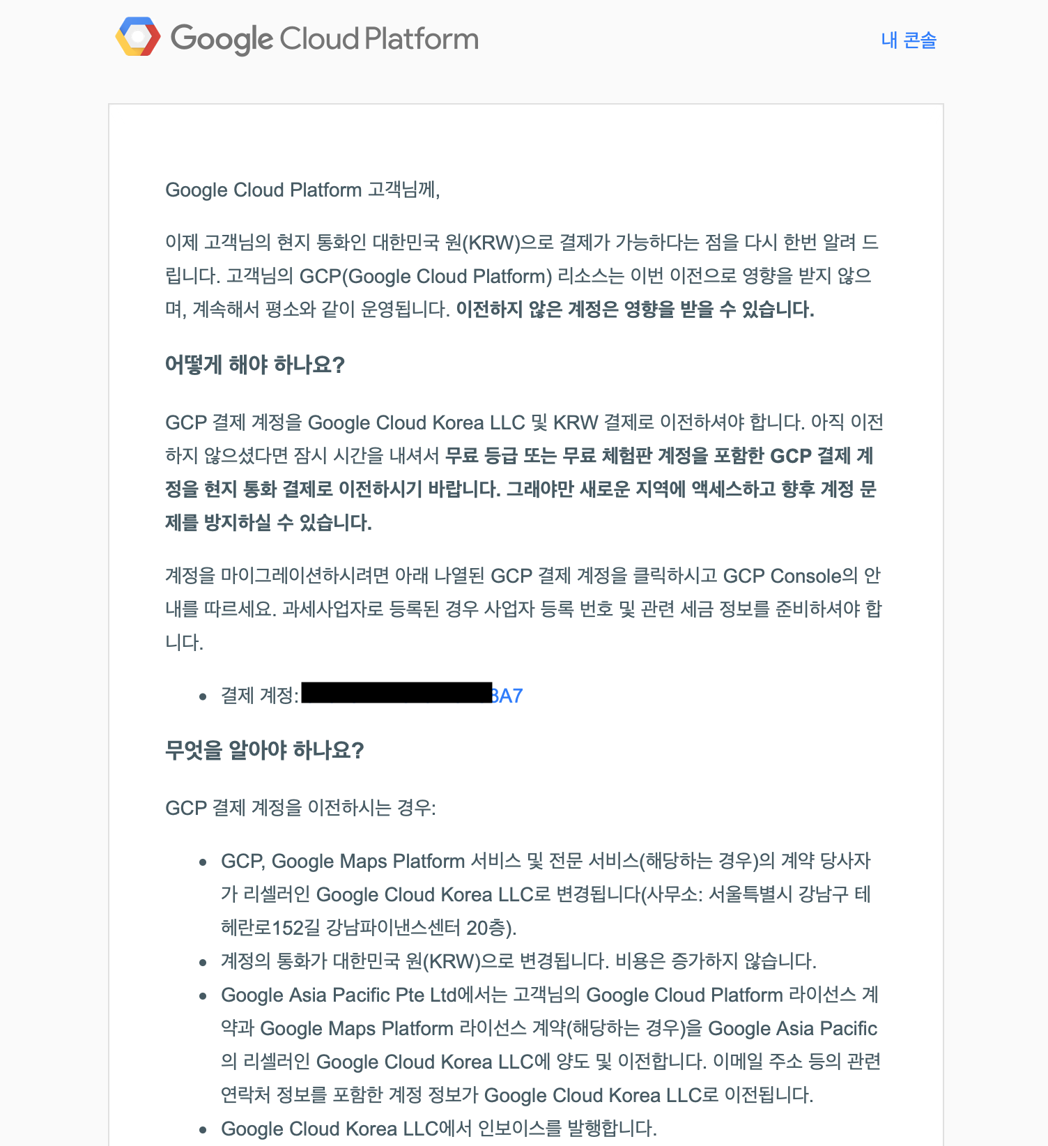 # 그러면서 기존 결제 계정에 대해 원화 단위로 계정 이전을 해야 한다는 메일이 왔다.!!