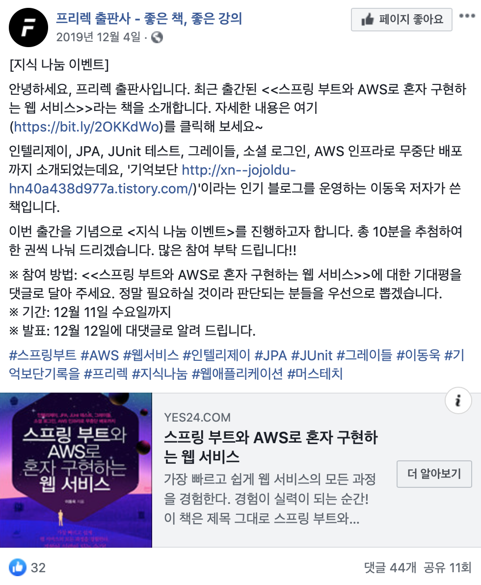 게다가 인텔리제이 IDE툴, JPA, Junit 테스트, gradle, social 로그인 구현, AWS 무중단 배포까지 다루는 내용이라 왠만한 다른 책들 보다는 넓게 경험해 보기 좋은 책이라고 할수 있습니다.