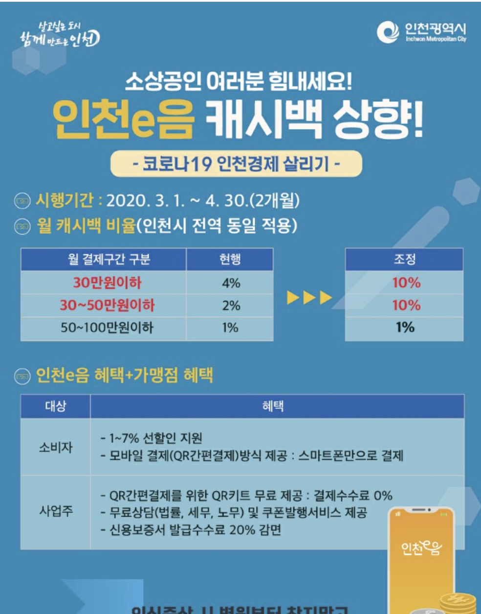 # 인천시에서 코로나19로 인해 지역경제활성화의 일환으로 인천 이음카드에대해 한시적으로 50만원까지 캐시백 10%를 준다고 합니다. 참고하세요~