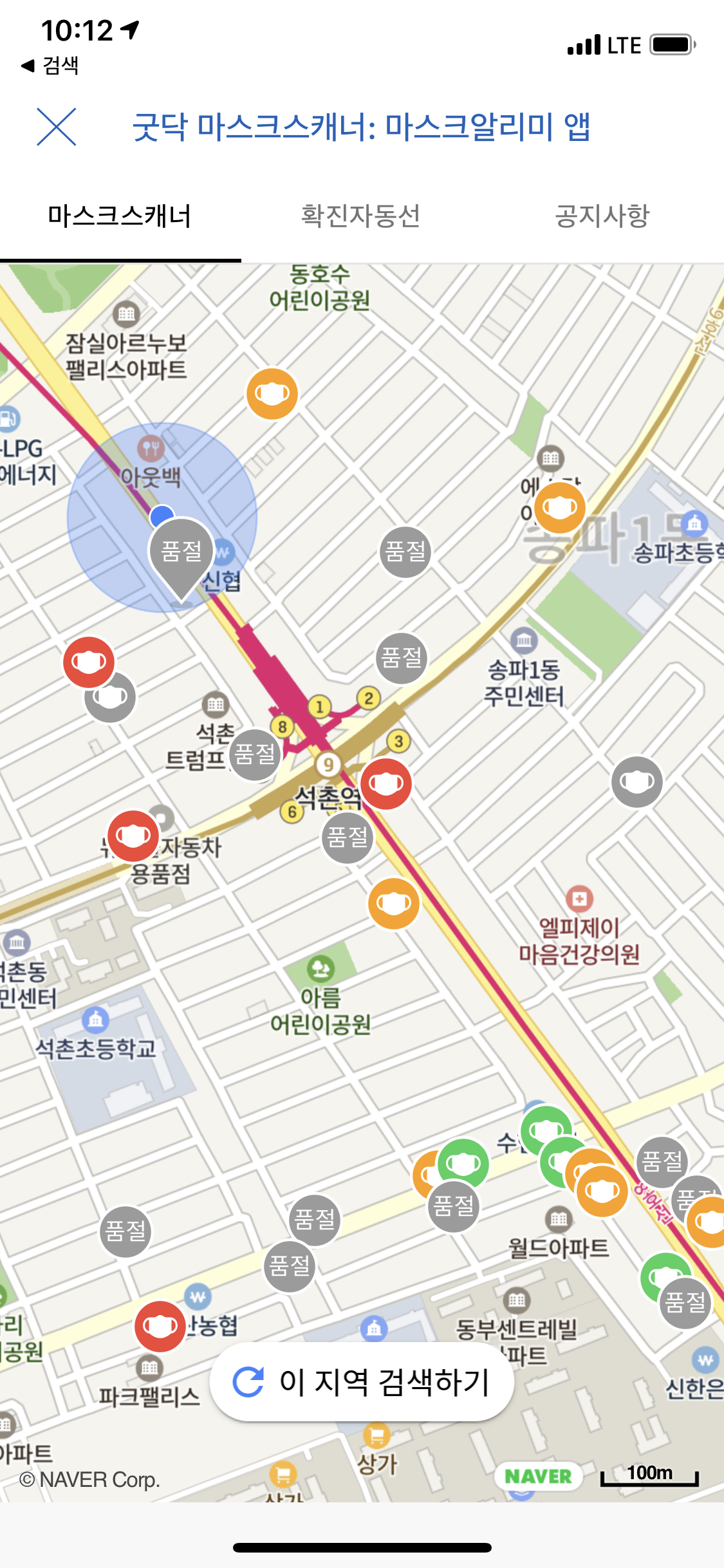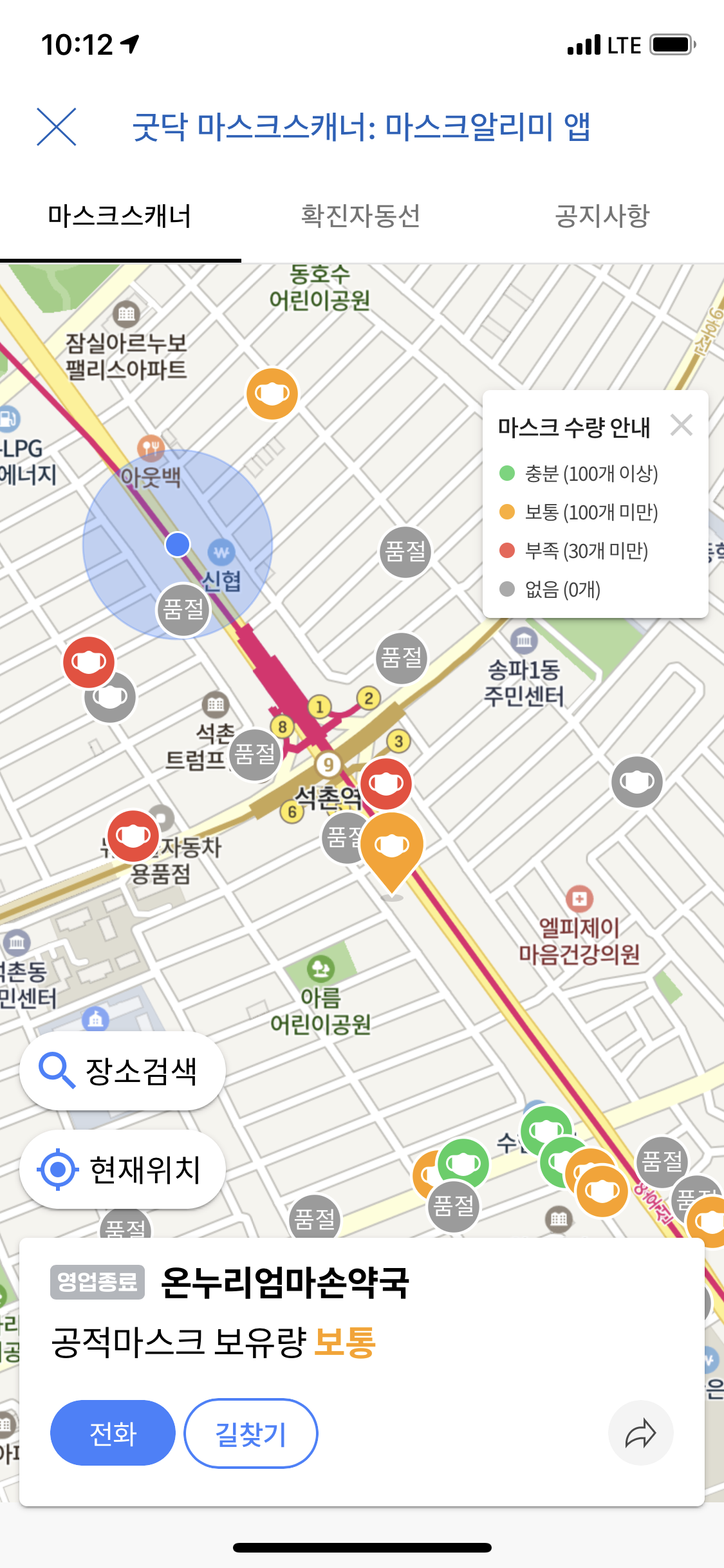 공지시항이 뜨고 지도를 클릭하면 약국이 위치와 마스크 아이콘들이 색으로 표시되네요.
