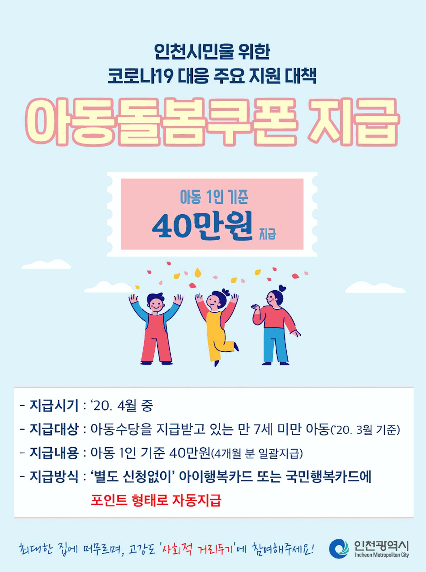 인천시는 코로나19로 위축된 지역경제를 활성화하고 아동 양육가구의 경제적 부담을 덜고자