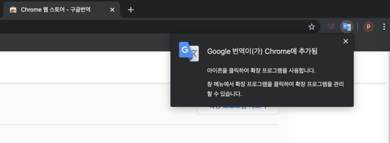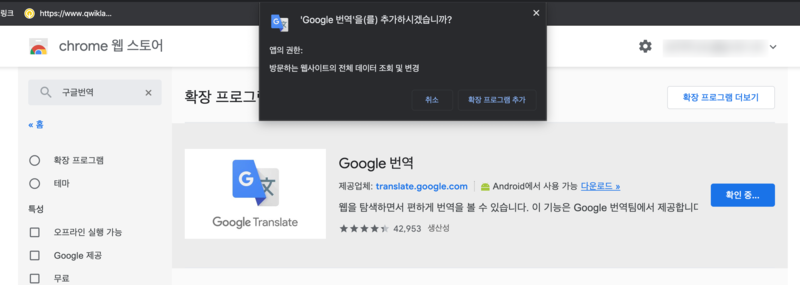 4. 검색된 화면에서 첫번째 "Google 번역" 을 [Chrome에 추가] 버튼을 눌러 설치한다.