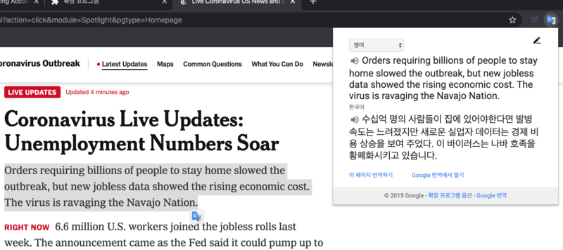 - 영문 사이트에서 내가 번역하고자 하는 부분을 드레그(Drag) 한 다음에 상단에 아이콘을 클릭 하면 내가 드레그 한 문장이 번역되어 나온다.