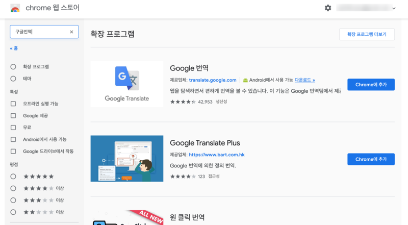 4. 검색된 화면에서 첫번째 "Google 번역" 을 [Chrome에 추가] 버튼을 눌러 설치한다.