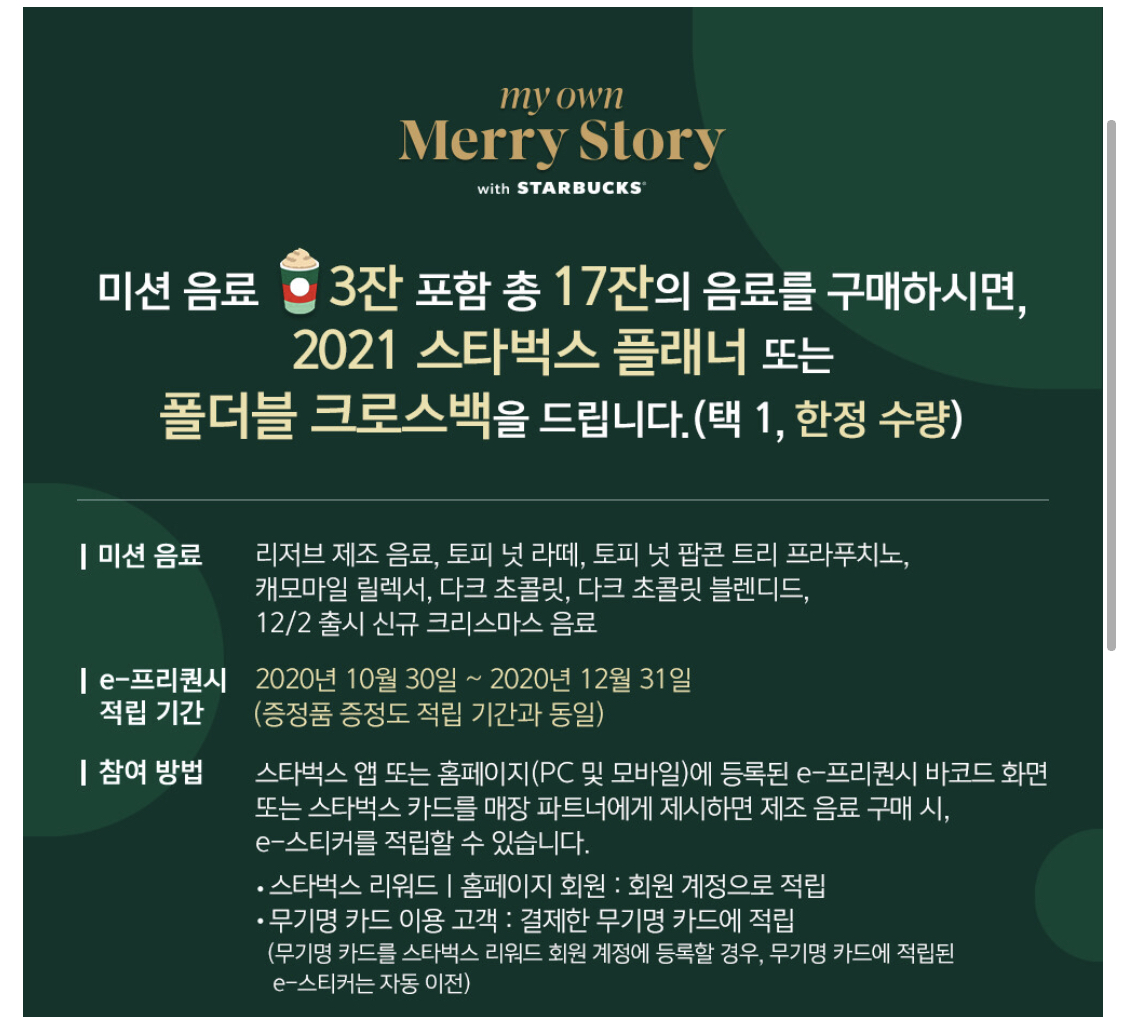 올해도 미션음료3잔 포함 총 17잔의 음료를 마셔야 하구요. 스타벅스 플래너 또는 폴더블 크로스백을 받으실 수 있어요.