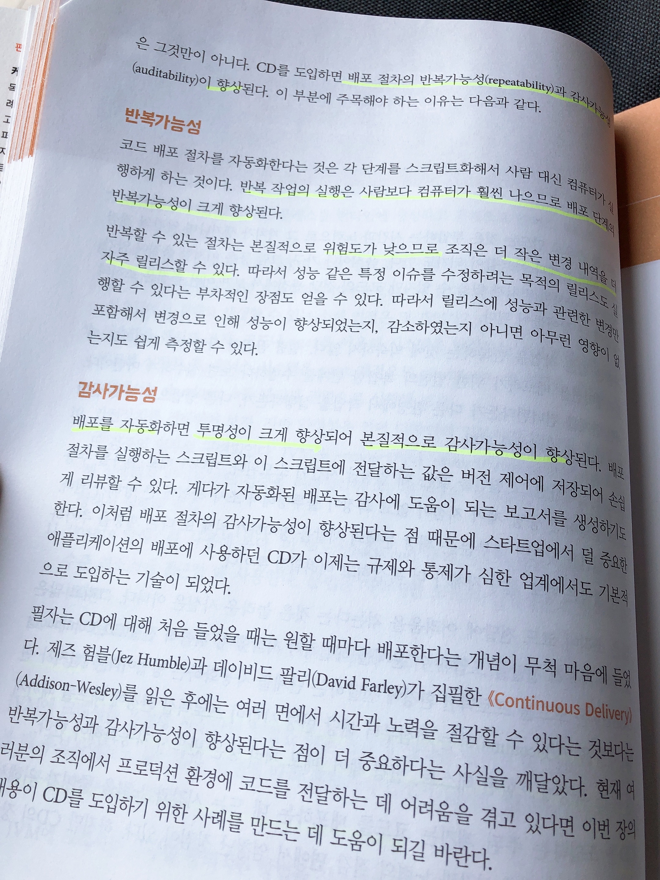 - CD를 도입하면 배포 절차의 반복가능성 과 감사가능성이 향상 된다.