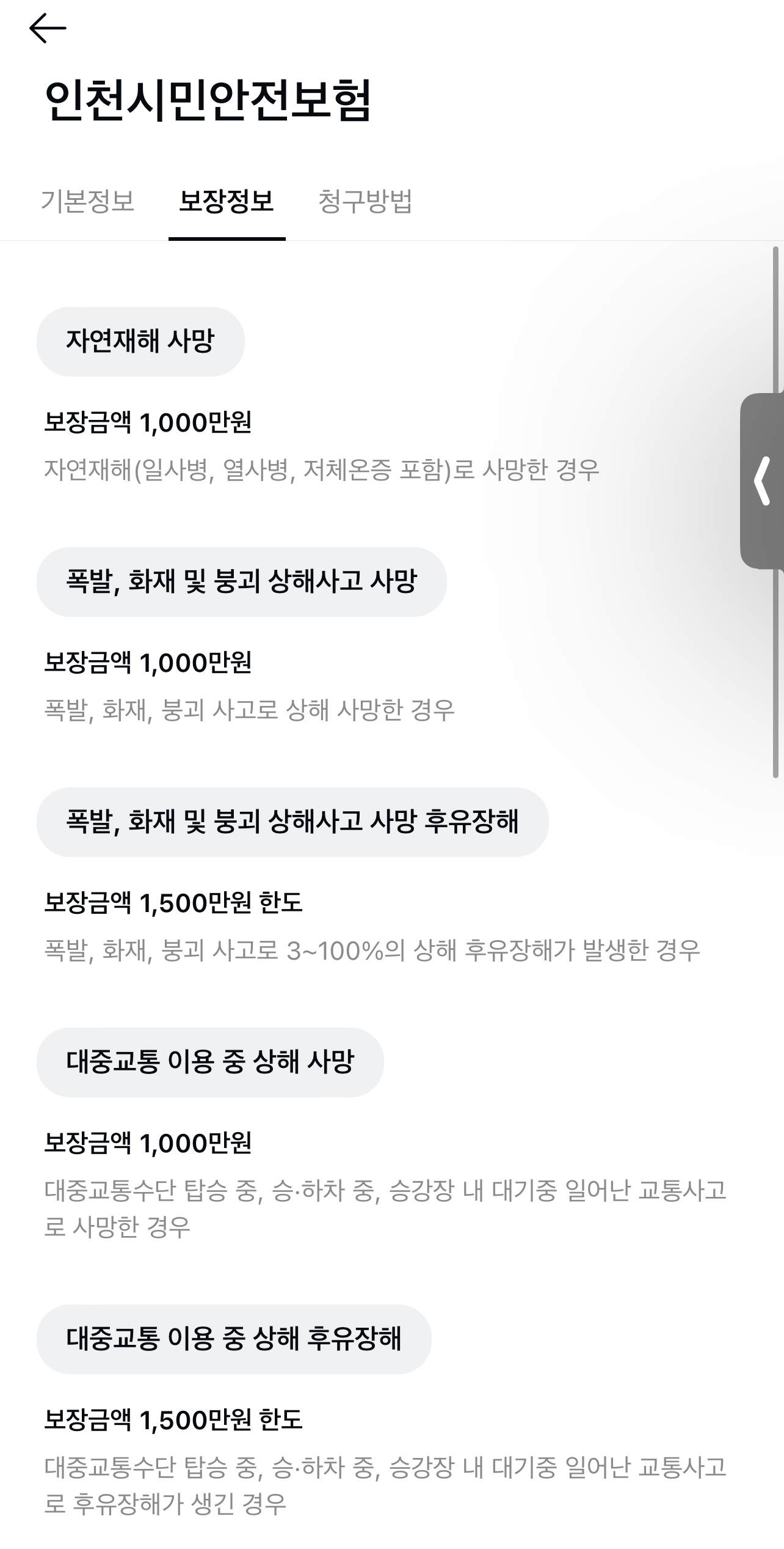 저는 인천에 살고 있기 때문에 인천시에서 가입해준 보험으로 보장정보를 확인해 보겠습니다. (2022.09 기준)