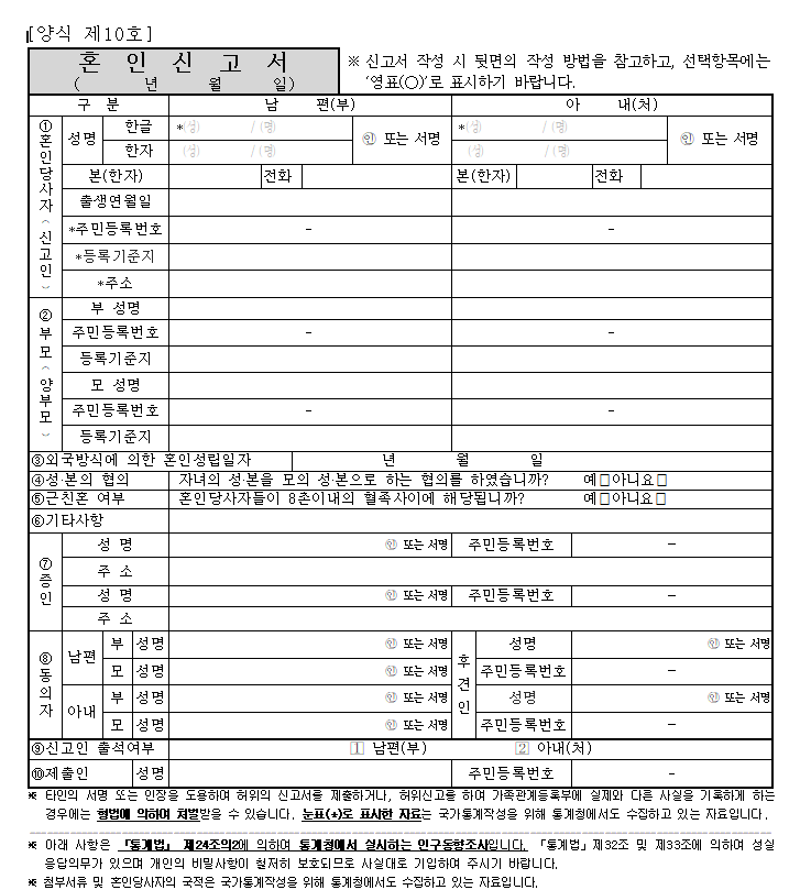 - 혼인신고서는 전자민원센터에서 다운받을수도 있고 각 읍면동 주민센터에서 비치되어 있는 양식을 사용할 수 있습니다.