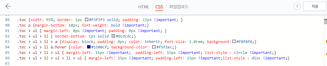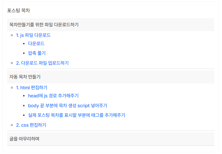 먼저 적용한 다음 css를 통해 하나씩 바꿔보면서 적용해본다면 조금 더 멋진 목차를 만들 수 있을 것이다.