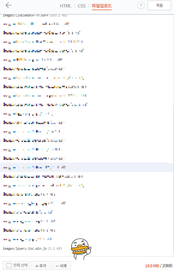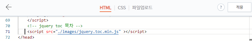 이곳에서 하단 추가 버튼을 눌러 jquery.toc.min.js를 업로드합니다.