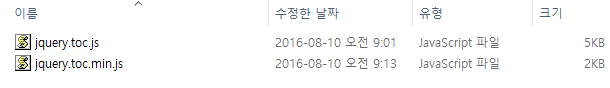 차이점은 jquery.toc.js를 압축한 것이 jquery.toc.min.js입니다.