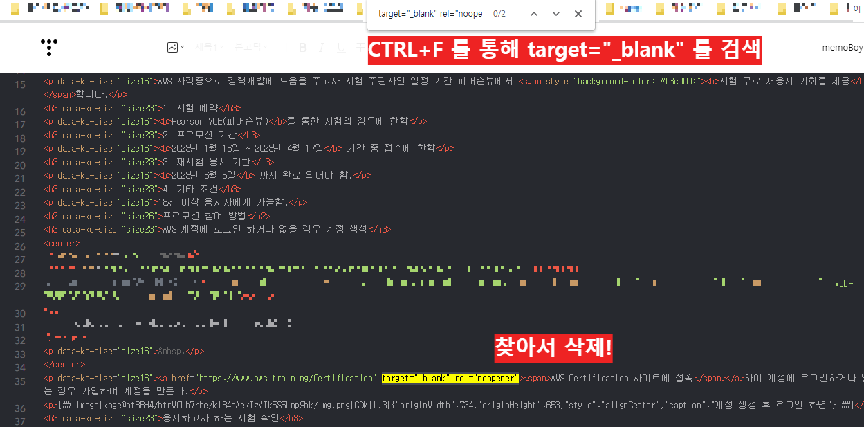 target="_blank" rel="noopener" 를 검색한 후 삭제를 해줍니다.