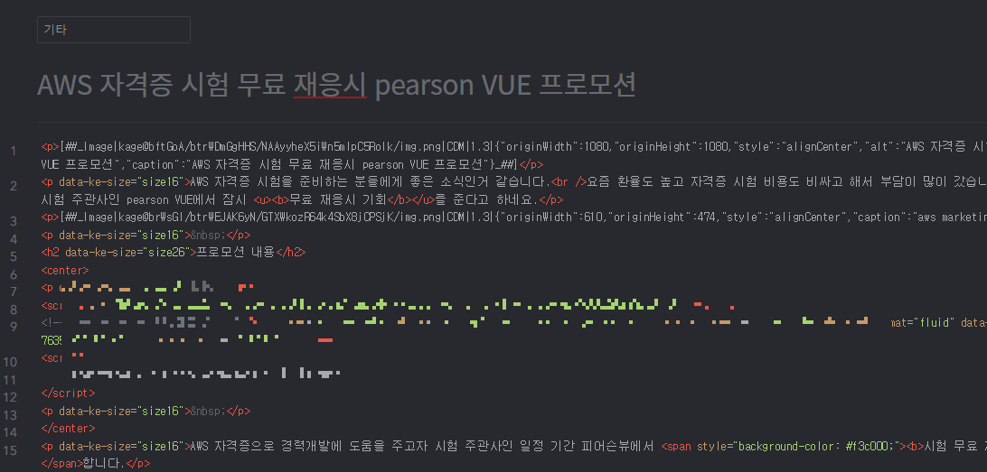 먼저 포스트 수정으로 들어가서 글쓰기 모드를 기본모드에서 HTML모드로 바꿉니다.