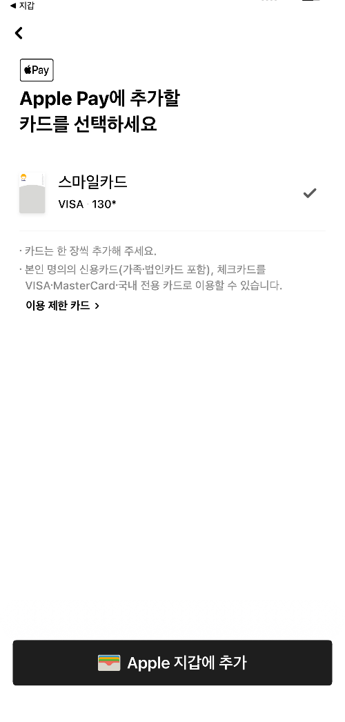 선택하셨다면 맨 하단의 [Apple 지갑에 추가] 를 눌러줍니다.