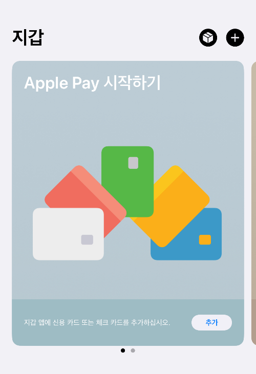 상단에 플러스 버튼이나 apply pay 시작하기 하단에 [추가] 버튼을 눌러줍니다.