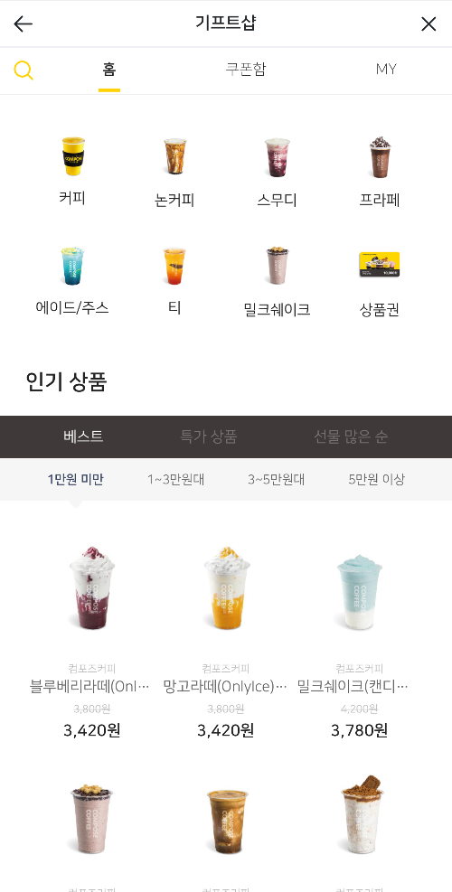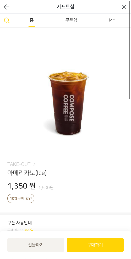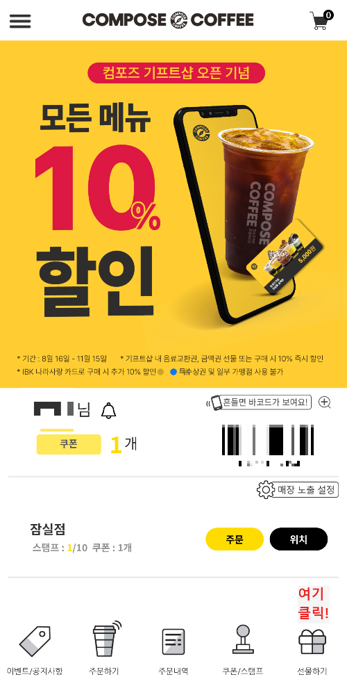 선물하기 기능이지만 개인이 구매해서 사용해도 되니 이벤트 기간동안 할인 받은 가격으로 컴포즈 커피와 음료를 즐기셔으면 좋겠어요.