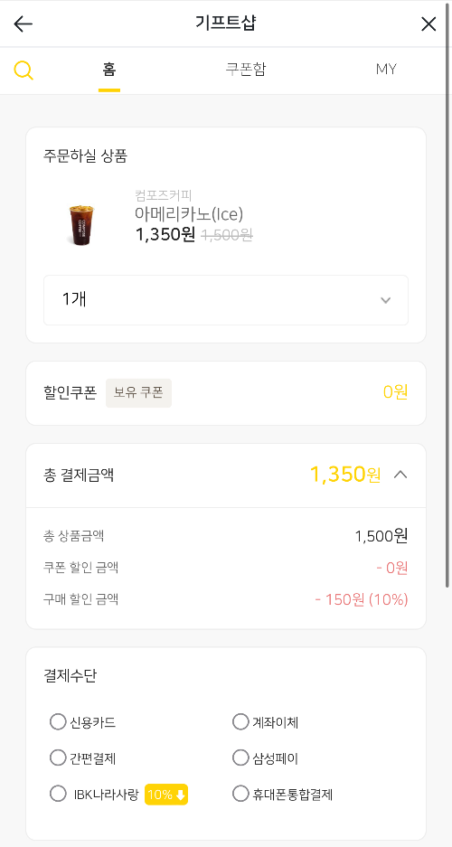 구매하기 버튼을 누르시면 결제하기 화면으로 넘어갑니다. 제가 아는 한 아메리카노는 컴포즈가 제일 저렴한거 같은데 거기에 10%를 더 할인 받을 수 있다니 꿀 혜택이라고 생각됩니다.