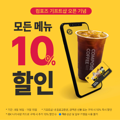 서비스 오픈을 기념해 오는 11월 15일까지 약 3개월간 할인 이벤트를 진행해요. 선물하기에 등록된 컴포즈커피의 전 제품군 및 음료 상품권 결제 시, 10% 할인된 가격으로 구매 가능하다고 해요. 이번 서비스를 통해 고마운 마음도 전하고, 할인 가격에 다양한 메뉴들을 만나보세요.