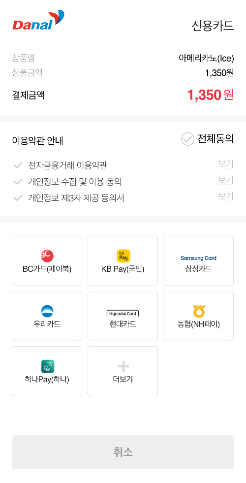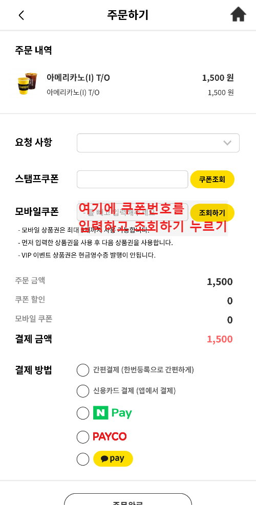 구매하기 버튼을 누르시면 결제하기 화면으로 넘어갑니다. 제가 아는 한 아메리카노는 컴포즈가 제일 저렴한거 같은데 거기에 10%를 더 할인 받을 수 있다니 꿀 혜택이라고 생각됩니다.