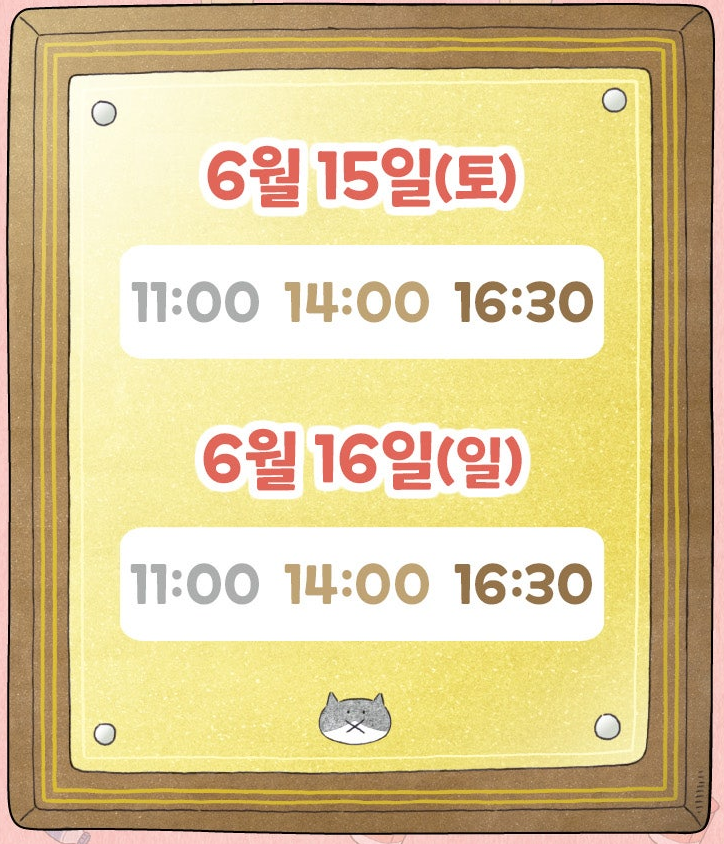 - 시간 : 토요일, 일요일 11:00, 14:00, 16:30 , 총 6회 진행됩니다.