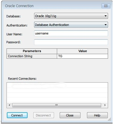 5. 위와 같이 Connection String 에 tnsnames.ora 파일에 적은 이름 값을 적은 후 connect 하면 ok!!!